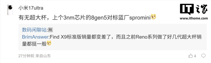 后续有用户在评论区表示:“节奏好紧[二哈]”,博主回复道:“固定一年两代,最近几代都卖得很好,也出得快[滑稽]”;另一名用户则询问道:“有无超大杯,上个3nm芯片的8gen5对标蓝厂spromini[狗头斜眼]”,博主则回复道:“”。